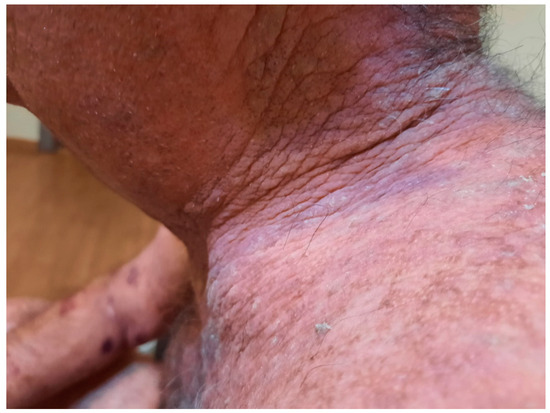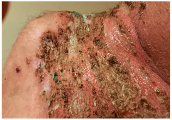After 2 months, the dose of methotrexate was decreased to 7.5 mg per week and methylprednisolone to 16 mg per day, and subsequently the patient developed new skin lesions consisting of flaccid blisters and painful erosions (Figure 10) accompanied by vegetating plaques in the neck area (Figure 11). Following this course, the doses of methotrexate and methylprednisolone were changed back to their initial starting doses, but this time the patient failed to show an improvement of his skin lesions.