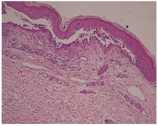 Given the clinical aspect of these lesions, pemphigus foliaceus was suspected, and a skin biopsy was performed. Hematoxylin and eosin (H&E) staining showed subcorneal acantholysis, confirming the clinically suspected diagnosis of pemphigus foliaceus (Figure 3 and Figure 4). Direct immunofluorescence is mandatory for confirming the presence of intercellular immunoglobulin deposition. This testing was unable to be performed at that time due to limitations associated with the cost of this testing. Oral corticosteroid treatment with methylprednisolone was initiated at an initial dose of 0.8 mg/kg per day together with oral azathioprine at 50 mg per day. After one month, the lesions did not improve and the patient was referred back to our clinic for reevaluation (Figure 5, Figure 6 and Figure 7).