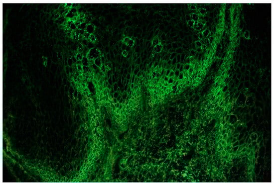 A biopsy for a direct immunofluorescence exam was taken from a normal-appearing perilesional skin area and it showed an intercellular deposition of IgG (Figure 14).