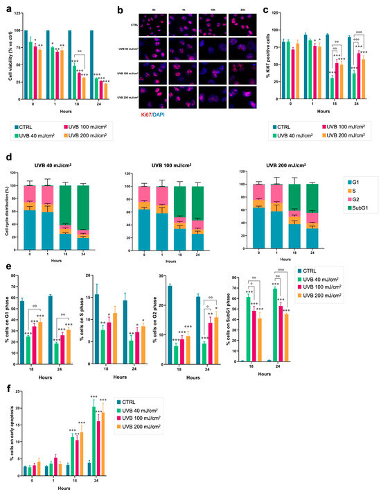 UVB exposure affects cell viability and proliferation. A375 cells were exposed to UVB 40, 100, and 200 mJ/cm2, and experiments were performed immediately after irradiation (0 h) and after 1, 18, and 24 h. (a) Cell viability was evaluated with MTT, and data are expressed as the mean ± S.E.M. of three independent experiments. (b) Ki67 immunofluorescence and (c) percentage of Ki67-positive cells out of total DAPI stained cells expressed as the mean ± S.E.M. of three independent experiments. (d) Percentage of cell cycle distribution and (e) percentage of cells in G1, S, G2, and SubG1 cell cycle phases measured by flow cytometry with PI in four independent experiments, expressed as mean ± SEM. (f) Percentage of early apoptotic cells measured by flow cytometry with annexin V-FITC/PI staining. Data are expressed as the mean ± S.E.M. of four independent experiments. * p < 0.05, ** p < 0.01, *** p < 0.001 vs. CTRL; ° p < 0.05, °° p < 0.01; °°° p < 0.001 vs. UVB groups. CTRL, control.