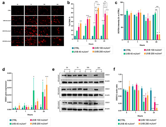 We found that UVB exposure affected DNA integrity (Figure 2a), even immediately after irradiation (0 h), reaching a peak at 18 h post-irradiation (Figure 2b). Additionally, 40 mJ/cm2 resulted in less DNA damage compared to the medium and high UVB doses, especially after a long post-irradiation period. We also found a significant increase after 24 h from 40 mJ/cm2 UVB exposure (Figure 2c), while in the presence of 100 and 200 mJ/cm2, we recorded a reduction. We also tested the expression of the 8-oxoguanine DNA glycosylase (OGG1) enzyme as part of the BER system, responsible for the excision of 8-OHdG. OGG1 gene expression was significantly raised 18 and 24 h post-irradiation, with 40 and 200 mJ/cm2 UVB (Figure 2d). However, Western blotting analysis (Figure 2e) and densitometric analysis (Figure 2f) showed that OGG1 protein expression was slightly reduced 18 h after low UVB dose exposure and strongly reduced 24 h post-irradiation.