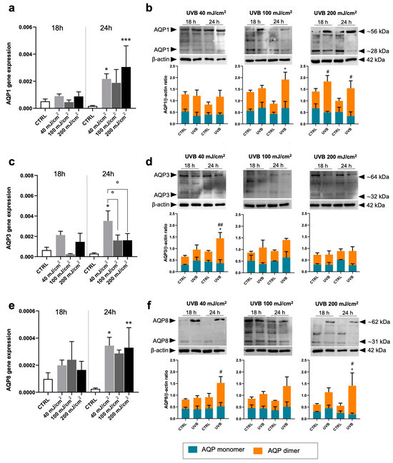 UVB exposure raised AQP1, 3, and 8 expression and induced protein dimerization. A375 cells were irradiated with UVB (low, 40, 100 and 200 mJ/cm2), and experiments were performed immediately after irradiation (0 h) and after 1, 18, and 24 h. Gene expression analysis of (a) AQP1, (c) AQP3, and (e) AQP8 are indicated as the mean ± S.E.M. of four independent experiments. Representative Western blotting was undertaken for (b) AQP1, (d) AQP3, and (f) AQP8, as well as the relative densitometric analysis of cells irradiated with UVB 40, 100, and 200 mJ/cm2. * p < 0.05, ** p < 0.01, *** p < 0.001 vs. CTRL; ° p < 0.05 vs. UVB; # p < 0.05, ## p < 0.01 monomer vs. dimer. CTRL, control.