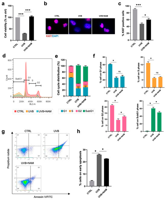 NAM restores cell viability and proliferation and inhibits cell death on UVB-irradiated cells. A375 cells were exposed to UVB 40 mJ/cm2 and stimulated with NAM 25 μM for 24 h. (a) Cell viability was evaluated with MTT, and data are expressed as the mean ± S.E.M. of three independent experiments. (b) Ki67 immunofluorescence and (c) percentage of Ki67-positive cells out of total cells stained with DAPI expressed as the mean ± S.E.M. of three independent experiments. (d) Representative cell cycle, (e) percentage of cell cycle distribution, and (f) percentage of cells in G1, S, G2, and SubG1 cell cycle phases measured by flow cytometry with PI in seven independent experiments expressed as the mean ± S.E.M. (g) Representative annexin V-FITC/PI flow cytometry and (h) percentage of early apoptotic cells. Data are expressed as the mean ± S.E.M. of six independent experiments. ns p > 0.05, * p < 0.05, *** p < 0.001. CTRL, control; NAM, nicotinamide.