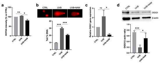 UV-irradiated cells treated with NAM demonstrated a significant reduction in intracellular ROS production (Figure 5a) that was linked with reduced DNA damage (Figure 5b) and, consequently, lowered expression of OGG1 at the gene level (Figure 5c). At the protein level, again, OGG1 expression decreased after UVB irradiation, but this trend was reverted in the presence of NAM (Figure 5d).