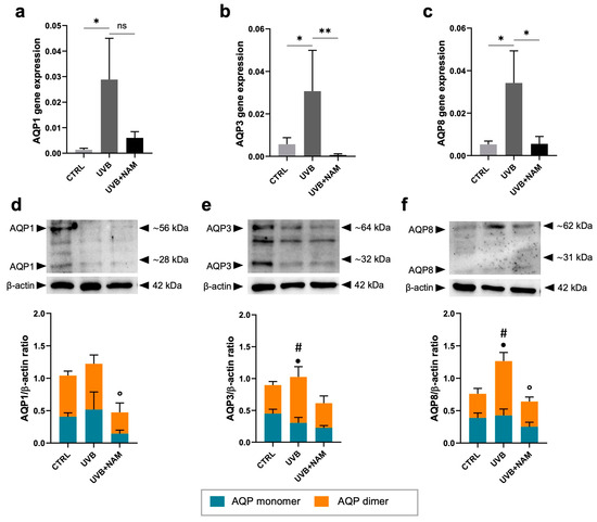 NAM stimulation reduces the expression of AQP1, 3, and 8 and dimer formation. A375 cells were exposed to UVB 40 mJ/cm2 and stimulated with NAM 25 μM for 24 h. Gene expression of (a) AQP1, (b) AQP3, and (c) AQP8 expressed as the mean ± S.E.M. of six independent experiments. Representative Western blotting and relative densitometric analysis of (d) AQP1, (e) AQP3, and (f) AQP8 expressed as the mean ± S.E.M. of six independent experiments. ns p > 0.05, * p < 0.05, ** p < 0.01. ● p < 0.05 vs. CTRL; # p < 0.05 monomer vs. dimer; ° p < 0.05 vs. UVB. CTRL, control; NAM, nicotinamide.