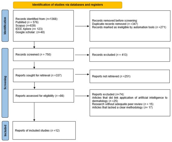 For the selection of studies, specific inclusion criteria were defined to ensure the review focused on the most relevant and original contributions. Only primary research articles evaluating the use of artificial intelligence in dermatology were included, specifically those describing the application of machine learning, deep learning, neural networks, and other AI-based techniques for the diagnosis and treatment of dermatological conditions. Systematic reviews, narrative reviews, and opinion papers were excluded to maintain the focus on original empirical evidence. To ensure the timeliness and relevance of the findings, the search was restricted to studies published between 1 January 2020 and 31 January 2025, in either English or Spanish.
