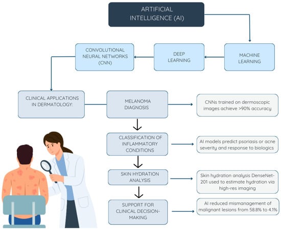 Hierarchical relationship between artificial intelligence (AI), machine learning, deep learning, and convolutional neural networks (CNNs), and their clinical applications in dermatology.