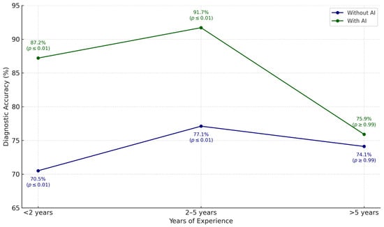 A multi-center study conducted in 2022 evaluated the diagnostic accuracy of 88 dermatologists with different levels of clinical experience (less than 2 years, between 2 and 5 years, and more than 5 years) by comparing their performance with and without the support of AI technologies, specifically the FotoFinder system when evaluating 30 different clinical cases. The results showed that, in all experience groups, the use of AI was associated with a significant increase in the accuracy of the diagnosis of malignant lesions, as illustrated in Figure 3 [13].