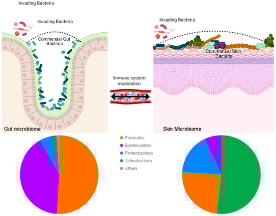 Figure showing the correlation between the gut and skin microbiomes, highlighting their barrier functions and communication pathways. The graphs illustrate the distribution of bacterial genera in both microbiomes [23,25]. Created with BioRender.com (https://BioRender.com/5u9ke81) in 1 August 2025. Figure credit: Siqueira, R.A.G.B.