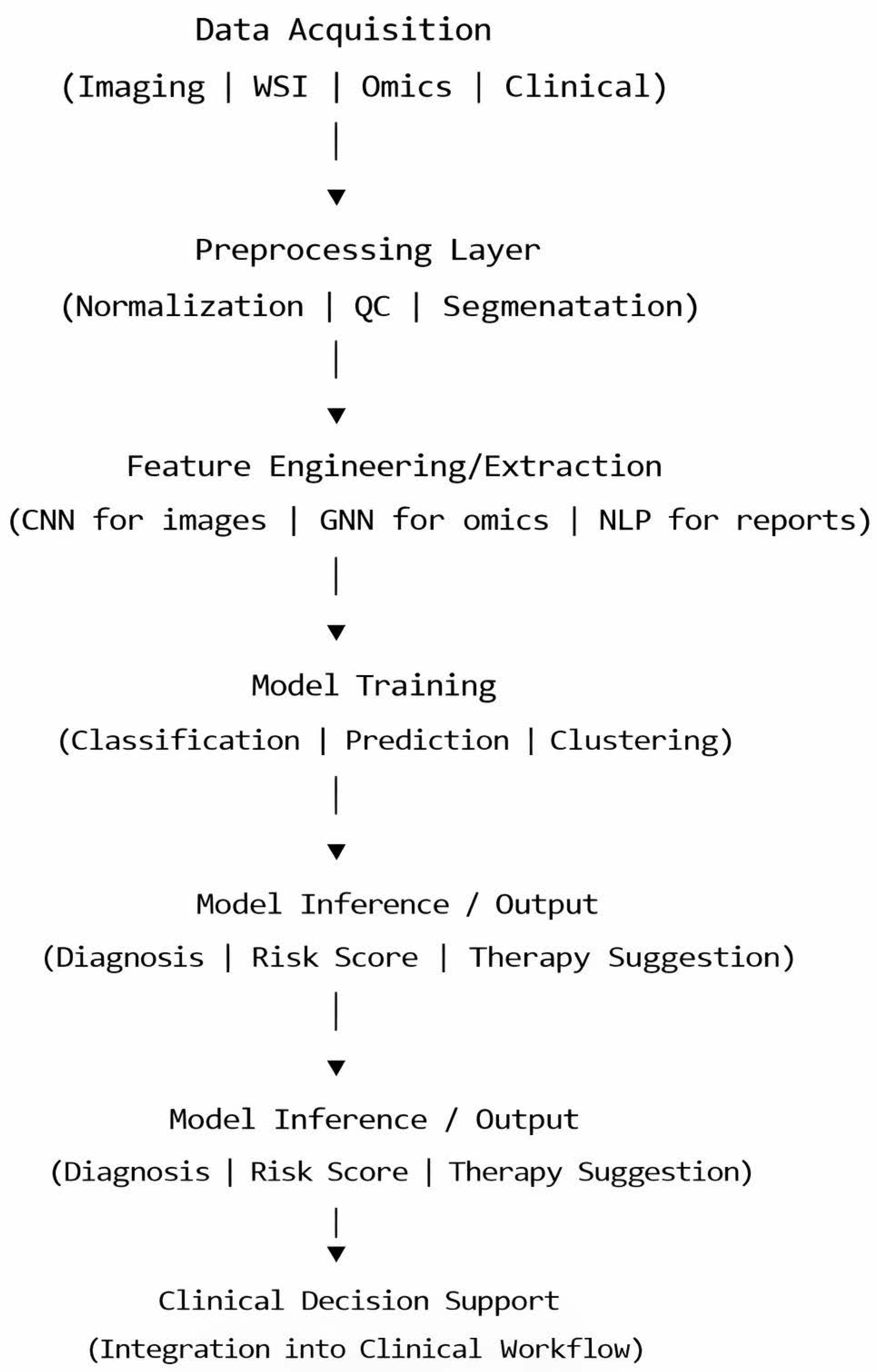 | Multimodal fusion | Image + omics + clinical | Precision oncology | Data harmonization |