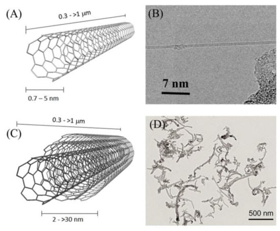 Representation of the structure of a single-walled carbon nanotube (SWCNT) (A) and a multiwalled carbon nanotube (MWCNT) (C) and their typical transmission electron micrographs (B,D). Adapted from [7].