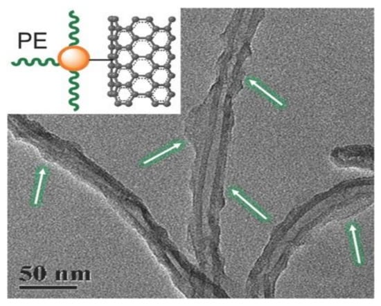 TEM images showing the low-density polyethylene (LDPE) chains grafted onto the MWCNTs. The inset shows a depiction of the polymer grafting. Taken from [31], with permission from Wiley-VCH.