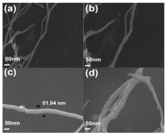 SEM images of MWCNTs: (a,b) pristine MWCNT and (c,d) PMMA–g–MWCNT. Taken from [45], with permission from MDPI.