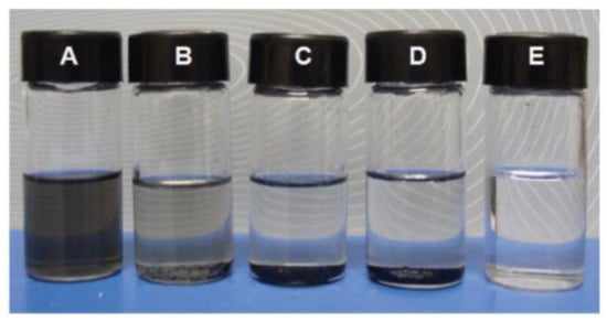 Image showing the solution stability of: (A) PS-g-MWCNT (t = 7 days), (B) PS/MWCNT (t = 5 h), (C) MWCNT–COOH (t = 5 h), (D) MWCNT–CH=CH2 (t = 5 h), and (E) dPS (defunctionalized PS from PS-g-MWCNT) with the same concentration of 1.0 mg/mL. Reprinted from [62], with permission from Wiley.