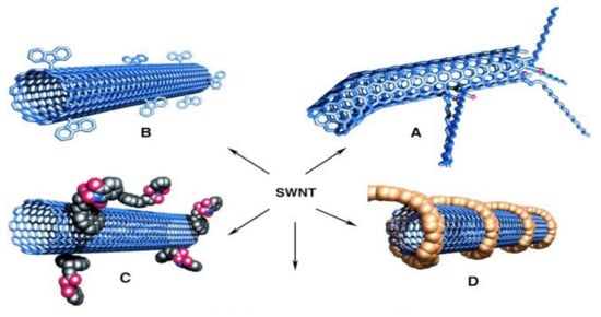 Schematic representation of the CNT functionalization routes using polymers: covalent functionalization at the CNT sidewalls (A) or defects (B) and non-covalent functionalization via π-π stacking interactions (C) or wrapping (D). Adapted from [17], with permission from Wiley-VCH.