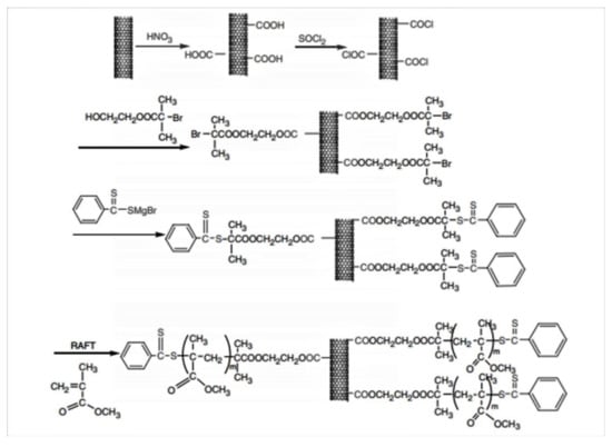 Surface-initiated reversible addition–fragmentation chain transfer (RAFT) polymerization of MMA from MWNTs. Taken from [57], with permission from Wiley.