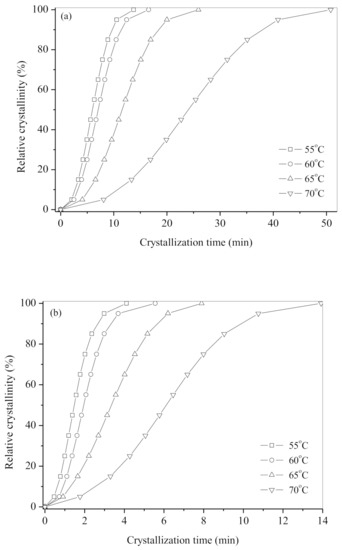 Plots of relative crystallinity versus crystallization time for (a) neat b-PES and (b) b-PES/CA0.2.