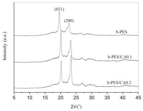 The effect of CA on the crystal structure of b-PES was further investigated. Figure 7 shows the wide angle X-ray diffraction (WAXD) profiles of neat and nucleated b-PES after isothermally crystallizing at 60 °C for 72 h. As clearly shown in Figure 7, all samples showed similar WAXD profiles, suggesting that CA did not change the crystal structure of b-PES. For neat b-PES, two main diffraction peaks appeared at 19.60° and 22.67°, corresponding to planes (021) and (200) of b-PES crystals, respectively [1]. For b-PES/CA0.1, the two diffraction peaks were observed at 20.10° and 23.23°, respectively. For b-PES/CA0.2, they appeared at 2θ = 20.22° and 23.35°, respectively. With increasing CA loading, the two diffraction peaks slightly shifted upward to a higher 2θ range, suggesting the variation in unit cell parameters. In brief, the incorporation of CA did not change the crystal structure of b-PES, despite the slight variation in unit cell parameters.