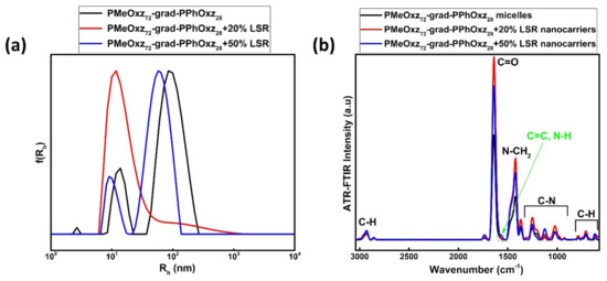 Comparative (a) size distributions from Contin of PMeOxz72-grad-PPhOxz28 nanoassemblies and LSR-loaded PMeOxz72-grad-PPhOxz28 nanocarriers at 90° in aqueous solutions, (b) ATR-FTIR spectra of PMeOxz72-grad-PPhOxz28 nanoassemblies and LSR-loaded PMeOxz72-grad-PPhOxz28 nanocarriers in aqueous solutions prepared by the TFHM.