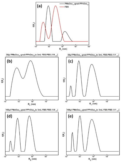 FBS is commonly known to simulate the physicochemical conditions of blood, containing diverse proteins, mostly bovine serum albumin (BSA) (approximately 2.5 mg/mL). Particularly, DLS stability studies of PMeOxz72-grad-PPhOxz28 nanoassemblies and LSR-loaded PMeOxz72-grad-PPhOxz28 nanocarriers in FBS solutions were performed to detect possible alterations of their physicochemical characteristics in terms of size, PDI and scattered light intensity. The physicochemical characteristics (Rh, PDI, Intensity) of bare FBS, PMeOxz72-grad-PPhOxz28 GC and protein-GC mixtures are summarized in Table 3, while the properties of LSR-loaded PMeOxz72-grad-PPhOxz28 nanocarriers and protein-GC/drug mixtures are gathered in Table 4. The protocol 1 (mixing of 50 μL sample with (a) 3 mL FBS:PBS (1/9 v/v) and (b) 3 mL FBS:PBS (1/1 v/v)) for the preparation of protein-GC and protein-GC/drug mixtures is denoted in Figure 4b,c and Figure 5b,c, and the protocol 2 (mixing of 100 μL sample with (a) 3 mL FBS:PBS (1/9 v/v) and (b) 3 mL FBS:PBS (1/1 v/v)) in Figure 4d,e and Figure 5d,e.