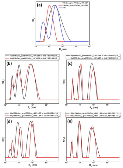 Comparative size distributions of (a) PMeOxz72-grad-PPhOxz28 + 20% LSR, PMeOxz72-grad-PPhOxz28 + 50% LSR nanocarriers and bear FBS, (b) PMeOxz72-grad-PPhOxz28 + 20% LSR + FBS:PBS (1/9 v/v) and PMeOxz72-grad-PPhOxz28 + 50% LSR + FBS:PBS (1/9 v/v) using protocol 1, (c) PMeOxz72-grad-PPhOxz28 + 20% LSR + FBS:PBS (1/1 v/v) and PMeOxz72-grad-PPhOxz28 + 50% LSR + FBS:PBS (1/1 v/v) using protocol 1, (d) PMeOxz72-grad-PPhOxz28 + 20% LSR + FBS:PBS (1/9 v/v) and PMeOxz72-grad-PPhOxz28 + 50% LSR+FBS:PBS (1/9 v/v) using protocol 2, (e) PMeOxz72-grad-PPhOxz28 + 20% LSR+FBS:PBS (1/1 v/v) and PMeOxz72-grad-PPhOxz28 + 50% LSR + FBS:PBS (1/1 v/v) using protocol 2.
