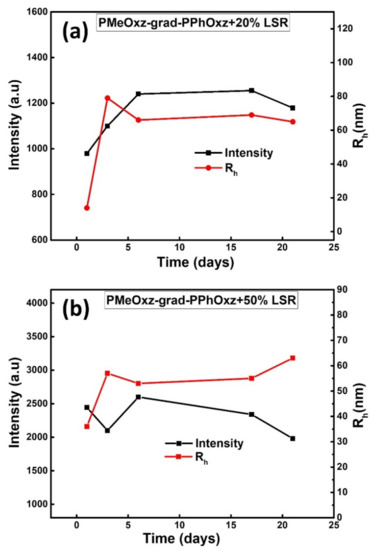 The physical stability over time of LSR-loaded PMeOxz72-grad-PPhOxz28 solutions was assessed by measuring their size and mass for a period of 23 days using DLS. The Rh and scattered intensity measurements (from cumulant analysis) versus time of LSR-loaded PMeOxz72-grad-PPhOxz28 nanocarriers are juxtaposed in Figure 6. The PMeOxz72-grad-PPhOxz28 + 20% LSR (Figure 6a) and PMeOxz72-grad-PPhOxz28 + 50% LSR nanocarriers (Figure 6b) do not exhibit significant Rh fluctuations indicating stable mixed nanostructures, while slight variations in scattered intensity are present within 23 days. Specifically, the Rh of both nanocarriers was steeply increased on the 3rd day, translated as a significant initial growth in the size of the mixed nanostructures (by 65 nm and 21 nm for the PMeOxz72-grad-PPhOxz28 + 20% LSR and PMeOxz72-grad-PPhOxz28 + 50% LSR nanocarriers, respectively). Both nanocarriers retained their size after the 3rd day up until the 23rd day, implying the formation of rather stable nanostructures. Notably, the mixed GC/drug solutions exhibited great long-term stability, as no visually detectable (with naked eye) drug precipitation was observed in a period of one year. Apparently, the corona formed by the hydrophilic PMeOxz segments of the GC effectively stabilized the resulting nanostructures.