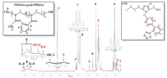 A plethora of NMR techniques was utilized for the structural elucidation of GC and LSR and the verification of the successful loading of LSR into the GC/drug solutions. Structural identification of PMeOxz72-grad-PPhOxz28 GC and LSR have been reported in previous publications [30,58]. The 1H-NMR spectrum for the PMeOxz72-grad-PPhOxz28 + 50% LSR nanocarriers in D2O in Figure 7, shows the distinct proton signals of LSR clearly (red letters), corroborating its successful loading in the polymeric nanocarriers. Notably, broader proton signals of the LSR phenyl group arise in positions 8–9 and 10–11, compared to those exhibited in previous studies utilizing different copolymers [45,46], implying stronger hydrophobic interactions between the phenyl group of PMeOxz72-grad-PPhOxz28 and phenyl ring of LSR. The chemical shifts of LSR proton signals in the presence of PMeOxz72-grad-PPhOxz28 nanoassemblies, PnBA30-b-POEGA70 [46] and PEO-b-PCL [45] micelles are gathered in Table 5, reflecting its great molecular flexibility and the different extent of interactions with different copolymers.