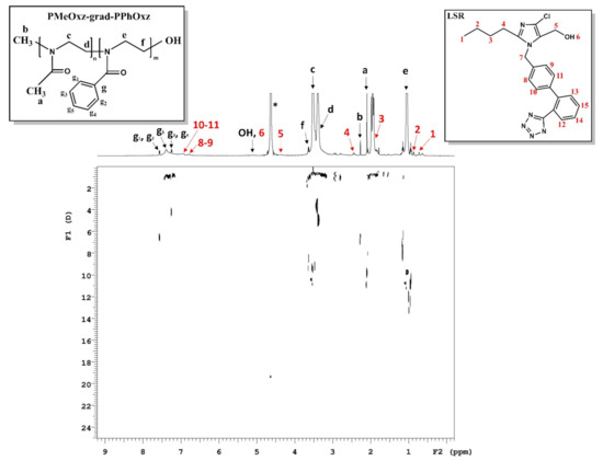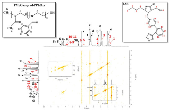 The internal structure of PMeOxz72-grad-PPhOxz28 GC and LSR moieties was confirmed by 2D-COSY measurements though intramolecular interaction analysis between their segments. The 2D-COSY spectrum of the PMeOxz72-grad-PPhOxz28 + 50% LSR nanocarriers is presented in Figure 8. The cross peaks, noticed between the protons of the GC and the protons of LSR in the 2D-COSY spectrum in Figure 8, signify the intramolecular interactions and the structural elucidation of GC and LSR.