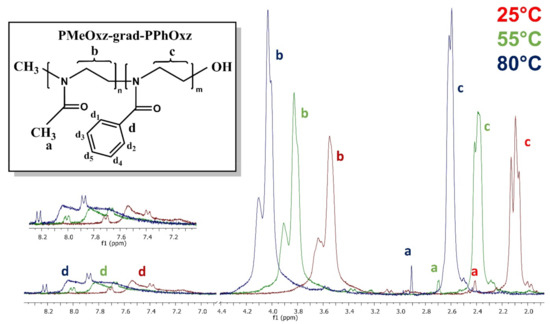 Additional 1H-NMR studies over a wide range of temperatures were conducted to reveal the mobility of protons during micellization. The 1H-NMR spectrum of PMeOxz72-grad-PPhOxz28 GC at three different temperatures is displayed in Figure 11. The 1H-NMR peaks of PMeOxz72-grad-PPhOxz28 GC presented in Figure 11, are shifting to lower field regions with increasing temperature. The half-width of PMeOxz72-grad-PPhOxz28 proton signals is decreased, while their integrated intensity gradually increases from 25 °C to 80 °C, implying the enhanced mobility of the protons.