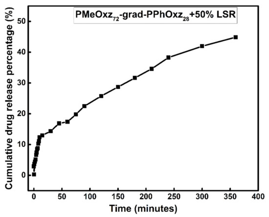 The cumulative drug release percentage vs. time is provided in Figure 12 for the PMeOxz72-grad-PPhOxz28 + 50% LSR nanocarriers. Based on UV-Vis results of Figure 12, an initial burst release of LSR is observed at the first fifteen minutes, followed by a continuous slow release of LSR, within five hours, without reaching a plateau. The initial burst release of LSR may be attributed to a small amount of the drug incorporated within hydrophobic-hydrophilic domains at the interface of the micelles, whereas the continuous slow release may be related to a larger amount of the drug encapsulated into the hydrophobic PPhOxz domains. The relatively low delayed LSR release (Table 6) implies that a significant portion of the encapsulated LSR is tightly bound to the PMeOxz72-grad-PPhOxz28 nanoassemblies.