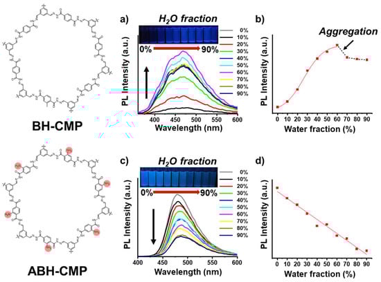 Photoluminescence (PL) emission spectra of (a) BH-CMP and (c) ABH-CMP in a water/DMF dispersion (1.0 mg/mL, water/DMF ratios of 0:10–9:1) (inset: images of BH-CMP and ABH-CMP under a 365 nm ultraviolet lamp). Plots of the PL intensity of (b) BH-CMP and (d) ABH-CMP versus the water fraction in a water/DMF dispersion.