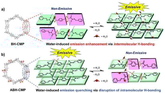 We found in our previous work that the emission of the BAH moiety is enhanced by planarization and J-aggregation induced by water-specific polymorphism rather than by the RIM mechanistic pathway exclusively [19], which led us to introduce the arylacylhydrazone into a CMP to obtain minimal intramolecular motion. We designed two types of acylhydrazone-based CMPs, i.e., with and without intramolecular hydrogen-bond donors (Scheme 1).