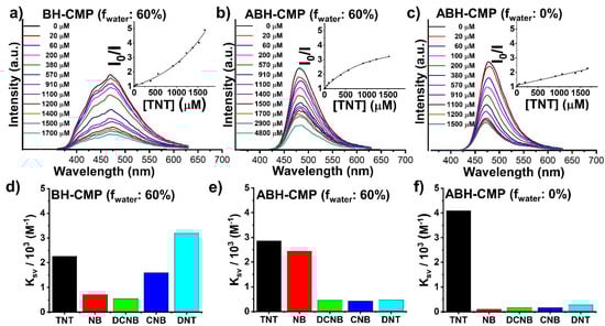 Photoluminescence (PL) emission spectra of (a) BH-CMP 60, (b) ABH-CMP 60, and (c) ABH-CMP 0 with different concentrations of 1,3,5-trinitrotoluene (TNT). The plots of relative PL intensity (I0/I) of BH-CMP 60, ABH-CMP 60, and ABH-CMP 0 versus TNT concentrations are provided as the inset plots (I = PL intensity, I0 = PL intensity at a TNT concentration of 0 M). Stern-Volmer constants with TNT, NB, DCNB, CNB, and DNT for (d) BH-CMP 60, (e) ABH-CMP 60, and (f) ABH-CMP 0.