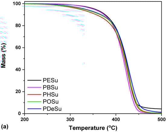 From the recorded ΤGA thermograms (Figure 1) it was found that all polyesters have high thermal stability, since their maximum decomposition step takes place at temperatures ranging between 420 and 430 °C. Similar decomposition temperatures were also reported for such aliphatic polyesters [6,16,19,21,32,35,36], whereas the effect of diol length and flexibility towards the thermal stability of the prepared polyesters was also exported [37]. Compared to the mass loss of the prepared polyesters, it could be seen that for PHSu, POSu, and PDeSu, it starts at slightly lower temperatures than for the other polyesters (PESu and PBSu). This could be attributed to the existence of some oligomers with lower degradation temperatures than the relative of the larger macromolecules, since these polyesters were prepared from diols with high boiling points (≥250 °C), and thus, cannot be easily removed during polycondensation, even after vacuum application. Therefore, this step occurs in a slower pace, requiring more time for the extension of the low-molecular weight chains, with the ester oligomers starting to degrade at lower temperatures.
