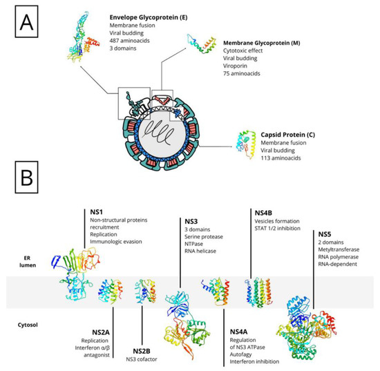 The virus has three structural proteins: capsid protein (C), envelope protein (E), and membrane protein (M), which were cleaved from the PrM propeptide after its translation (Figure 1A). These proteins have a binding function to the host cell, inducing the viral genome penetration into the cytoplasm after its partial fusion as well as assisting in the assembly, budding, and maturation of the new viral particles. Nonstructural proteins (NS1, NS2A/B, NS3, NS4A/B, and NS5) are present mainly in the ER and play the central role in viral replication (Figure 1B) [47].