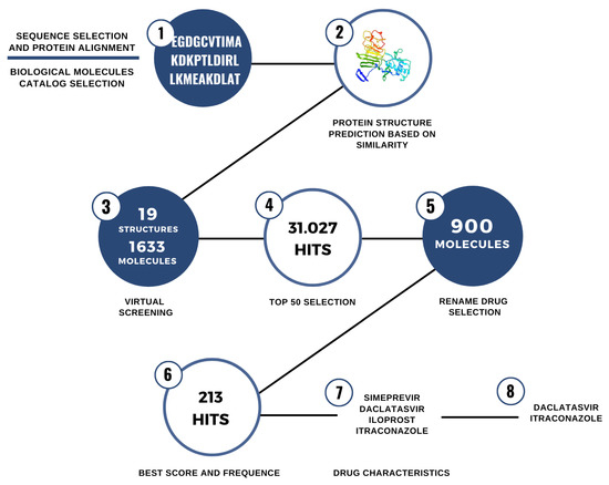 After the selection of ITC and DAC, we carried out new directed dockings with the target proteins using more refined analysis parameters. The flowchart of the selection of candidate drugs is described in Figure 2.