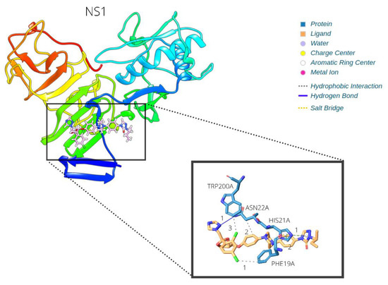 The NS1 protein was found to be an interesting target for this drug, since it was the best scored candidate. This 355 amino acid protein is located in the endoplasmic reticulum, is secreted N-glycosylated in homohexameric form, and interacts with the E protein and NS4B. It also interacts with the host CFH complement protein leading to C3 degradation. It has three destinations after its cleavage: (i) the replication cycle, where it is necessary for the formation of the replication complex and recruitment of other NS proteins in the ER membrane structures; (ii) the plasma membrane; and (iii) the extracellular compartment, where it is excreted in lipoparticles, antagonizes complement function, and aids in the evasion of the immune system [47]. We highlight the ITC–NS1 interaction in Figure 4.