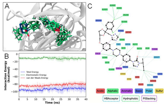 Simulation of itraconazole–NS1 interaction by molecular dynamics. (A) Final frames from simulation replicas highlighting the ITC position conservation throughout the simulations. (B) Stable, favorable interaction energies obtained from the simulations (dark colors—average; lighter colors—standard deviation). (C) NSI–ITC interactions observed for at least 70% of the simulation time.