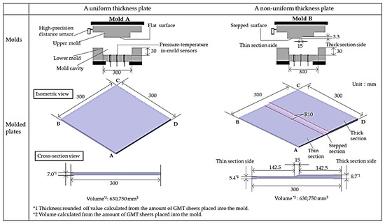 Compression molding is the oldest material processing technique used in the industrial, commercial, and consumer parts manufacturing process for high production volume for both thermoplastic and thermoset polymers. Thermoplastics such as ABS, nylon, polycarbonate, polyethylene, polypropylene, polystyrene, and various blends are used for compression molders. In addition, thermosets such as epoxy, phenol-formaldehyde, and elastomers are also processed in smaller quantities [23]. This process is mainly used to produce screw caps for bottles, sheets for food containers, and other liquid containers in the food packaging industries. This process delivers products with increased mechanical resistance, insolubility, and thermal stability in the curing or cross-linking process due to the presence of both pressure and heat [24]. Bulk molding compound (BMC) and sheet molding compound (SMC) and produced from thermosetting polymers, while glass mat thermoplastics (GMT) are produced from thermoplastic compounds through compression moldings. Figure 2 illustrates the uniform and nonuniform plates produced by compression molding. Mold A produces uniform plates due to its flat surface in the upper and lower molds, whereas Mold B produces nonuniform plates with a thin section, stepped section, and thick section [25]. In both types of compression molding, a hot treatment may be applied, which requires both pressure and temperature, as well as a cold treatment, which requires only pressure. [26]. Xie et al. produced highly flexible starch-based films with [Emim][OAc] as plasticizer, which inhibited the bacterial attack using a simple melt-compression molding process [27]. The main advantage of a compression molding process is that it can be performed even when the viscosity of the final formulation is not very low [28].