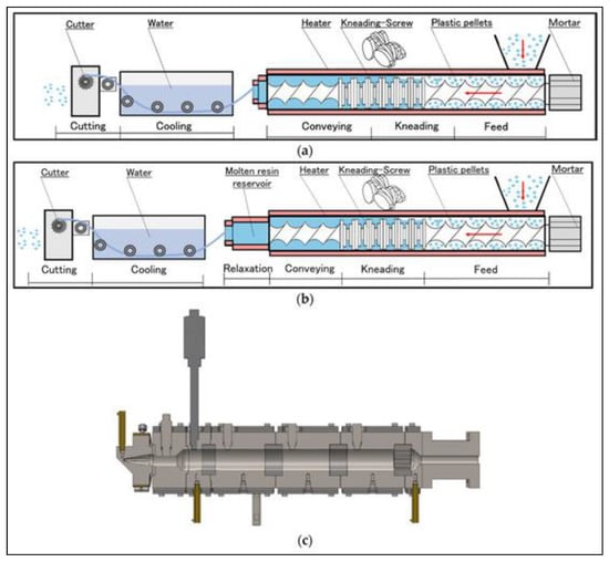 Schematic of the screw extruder (a) without and (b) with the molten resin reservoir, and (c) cross-sectional schematic of the molten resin reservoir. Reproduced from ref [34].
