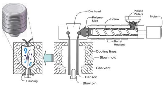 Blow molding is a process of forming a hollow object by inflating it with air using an extruder or thermoplastic molten tube called a parison. The air-blown tube acquires the shape of the mold, and the formed parts are cooled in the blow mold taking the desired shape without wrapping. The blow molding consists of three types, namely, extrusion blow molding, stretch blow molding, and injection blow molding. Stretch blow molding has numerous advantages such as a low cost, a low gram weight, the optimization of the preform design, durability, and a high-volume production [35]. The extrusion blow molding is a workhorse process of polyolefins such as HDPE and PP, to produce plastic containers such as bottles, jars, and containers, as shown in Figure 4 [36]. PET resins are not suitable for this method. It is classified into two major categories namely continuous extrusion and intermittent extrusion. Injection blow molding is a process where the resin is injected into a preform cavity through a horizontal screw and the parison is blown into the final shape and cooled. Resins such as HDPE, PS, PET, and PVC are used for producing bottles via injection blow molding [24]. The core rod carrying the product is heated to 120 °C and the strip bar removes the final product. Stretch blow molding is used to manufacture poly(ethylene terephthalate) (PET) bottles for the soft-drink beverage industry. In this process, the parison or preform is stretched in both axial and hoop directions.