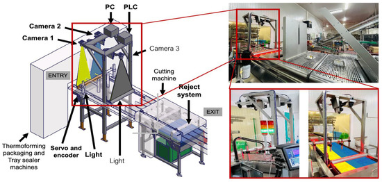 An illustration of the major elements of the suggested computer vision system, with views of the genuine scenario (bold). A servo and an encoder attached to a programmable logic controller (PLC) regulate the speed at which the food packages move, the position of the items, and the timing at which the reject system must be activated. The cameras are positioned between the tray sealer and the cutting equipment. Images for the sealing test are acquired by triggering monochrome line scan cameras 1 and 2 at various exposure periods. Images for the serigraphy and traceability tests are captured using camera 3. Then, after the photographs have been acquired, the reject system is processed to determine how to move forward. Reproduced from ref. [39] with permission from Springer Nature, 2021.