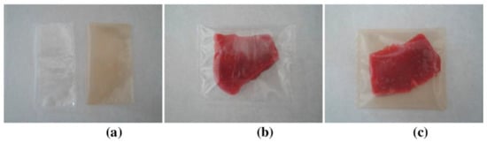 Comparative images of tested films (a); sample of meat packaged with blank film (b) and, with active film (c). Reproduced from ref. [95] with permission from Elsevier. 2015.