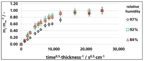 Water vapor absorption at 23 °C; PP with 6 wt. % NaCl, foamed and stretched with stretching factors of 2.5 × 2.5. Reproduced from ref. [108] with permission from Elsevier. 2018.
