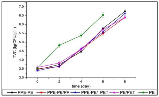Pušnik et al. explored the antioxidant and antibacterial properties of kraft lignin and tannin and their potential contribution to the improved multifunctionality of polylactic acid (PLA) films [72]. PLA based composites were prepared using hot-melt extrusion with the incorporation of lignin and tannin, resulting in a biodegradable film. The composite films exhibited excellent surface mechanical properties as well as antioxidant and antimicrobial activity, which made them suitable for food packaging applications. Furthermore, pomegranate-peel-derived tannin (PPE) was exploited by Hu et al. [119], who prepared double-layer active films with PPE/polyethylene as the inner layer and two different active films with different outer layers, PPE-PE/poly (ethylene terephthalate) (PET) and PPE-PE/PP, and a comparative study was carried out. All three films exhibited a lower microbial growth on pork samples and significant excellent oxygen barrier properties that extended the shelf life. Changes of total viable counts (TVC) during the refrigerated storage period indicated whether it satisfied acceptable cooking standards, as depicted in Figure 11 [119]. The initial TVC of pork steaks for all treatments was from 3.4 to 3.58 log10 CFU/g, indicating that the pork steak was of good quality.