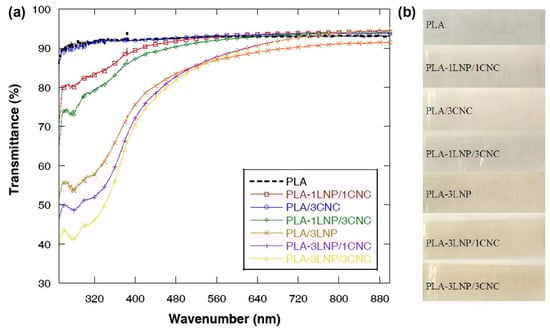 UV–vis spectra of PLA and PLA nanocomposite films containing CNC and LNP nanoparticles in binary and ternary systems (a) and visual appearance of the films (b). Reproduced from ref. [120] with permission from Elsevier. 2016.
