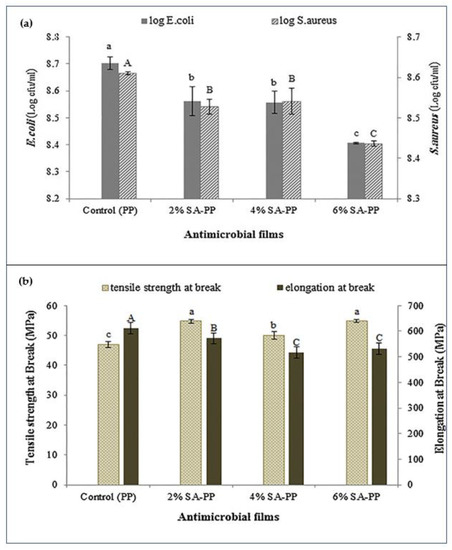 (a) Effect of different concentrations of SA on antimicrobial effects (b) mechanical properties of SA-PP films. * Small and capital letters represent a significant difference between samples for tensile strength at break (T) and elongation at break (E), respectively (P < 0.05). Reproduced from ref. [121] with permission from Elsevier. 2018.