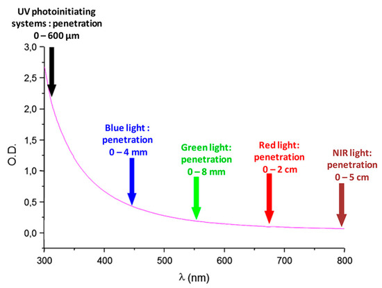 The reactivity of photoinitiators and the light penetration that can be achieved within the photocurable resin is also strongly related to the wavelength used for photoinitiation. Indeed, as shown in Figure 1, light penetration can vary from a few hundreds of micrometers up to a few centimeters, depending on the fact that photopolymerization is mostly carried out in the wavelength range between 350 nm and 800 nm [33]. By polymerizing at longer wavelengths, a higher light penetration can be obtained within the photocurable resin. Access to filled samples is also possible [34].