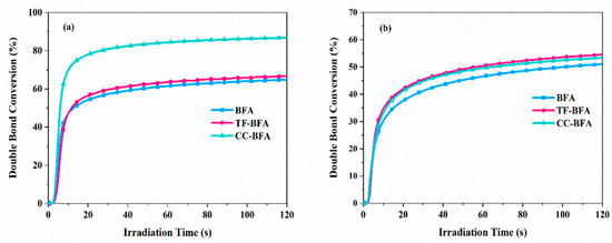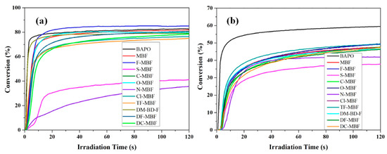 Photopolymerization profiles of (a) TPGDA and (b) TMPTA in laminate using the different MBFs or BAPO (1 wt%) upon irradiation at 405 nm. Reproduced with permission of Ref. [229]. Copyright 2021. The American Chemical Society.