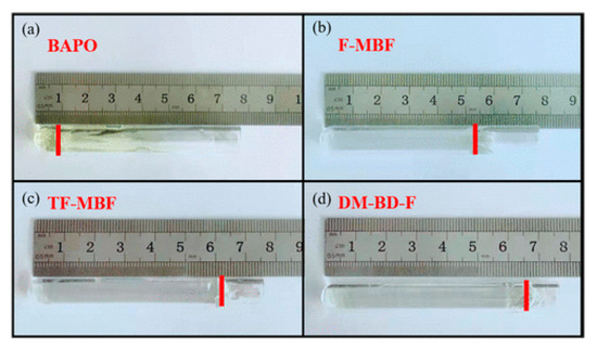 Finally, examination of the depth of cure for TPGDA after 30 s of irradiation at 405 nm with the different systems revealed F-MBF TF-MBF, and DM-BD-F to furnish a curing depth of 5.0, 6.3, and 6.5 cm respectively, greatly higher than that of BAPO (1.0 cm) (See Figure 5). Noticeably, good photobleaching could be obtained during photopolymerization so that colorless polymers could be obtained with all MBFs.